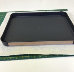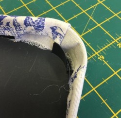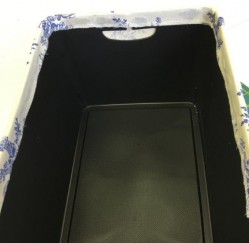 Place your lid onto the wrong side of the lid fabric. Make sure the lid is correctly placed onto the fabric so you have sufficient fabric on all side to cover the lid and the inside lid.