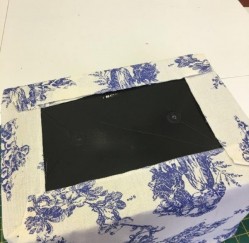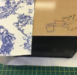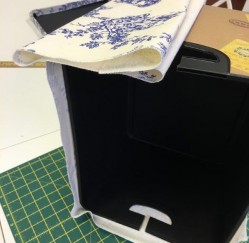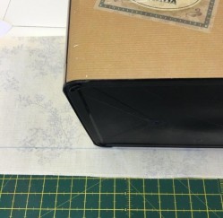 Using the line you have drawn as a guide start sticking the fabric to the box. I found it easiest to start in the middle of the longer side to the box. Don’t start at one of the corners