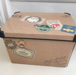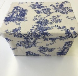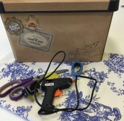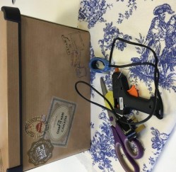 Collect together the materials you will need. These are a box with lid to cover, fabric, scissors to cut the fabric and a glue gun or other glue. If you don’t have a sewing machine or overlocker choose a fabric that does not fray.