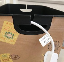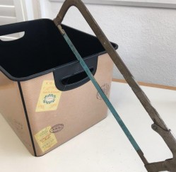 Choose a box that has handles in the side for holding it and use the hacksaw or strong scissors to cut a channel from the top of the box to the handle.