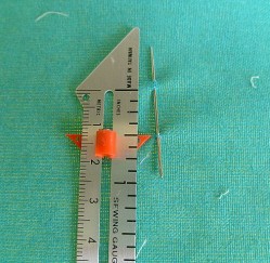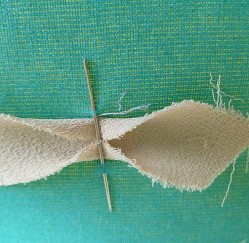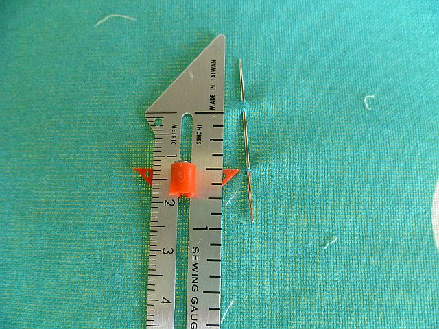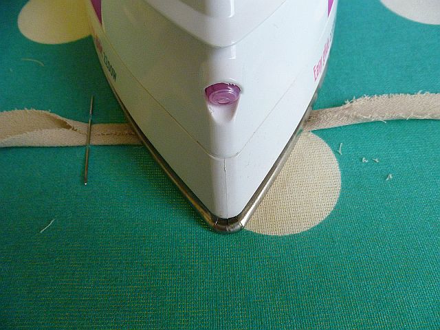 On your ironing board insert a needle as shown in the picture. The amount of the needle above the ironing board should be half of the width of your strips. For my binding this is 1/2 inch.