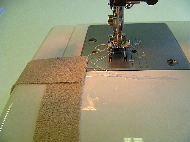 Feed the end of the strip through the needle. Make sure the right side of the fabric is against the ironing board. If you have trouble feeding the end through the needle try cutting the fabric end to a point.