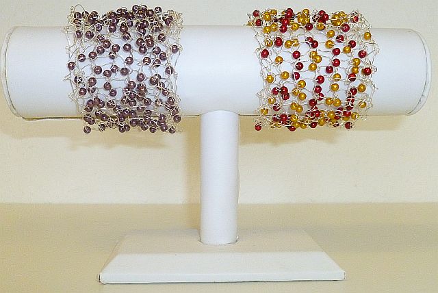 We are making these lovely beaded wire cuffs on Thursday 18 October. A great class for everyone whether you are new to jewellery making or have some previous experience. Once you have learnt the basics start experimenting with different colours and thickness of wires and beads. Vary the pattern to make different widths of cuff or extend it to make a collar or necklace.