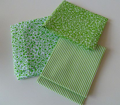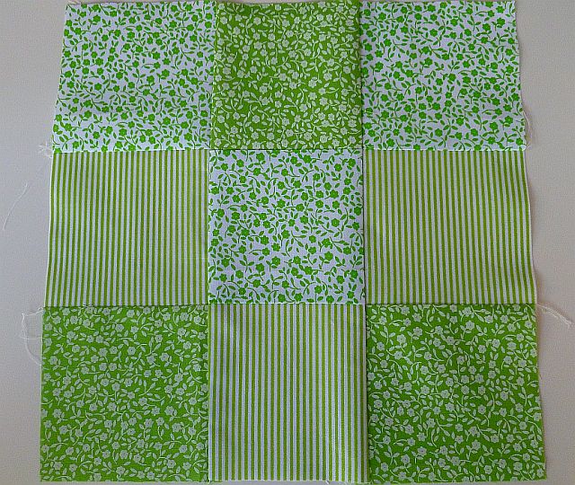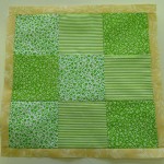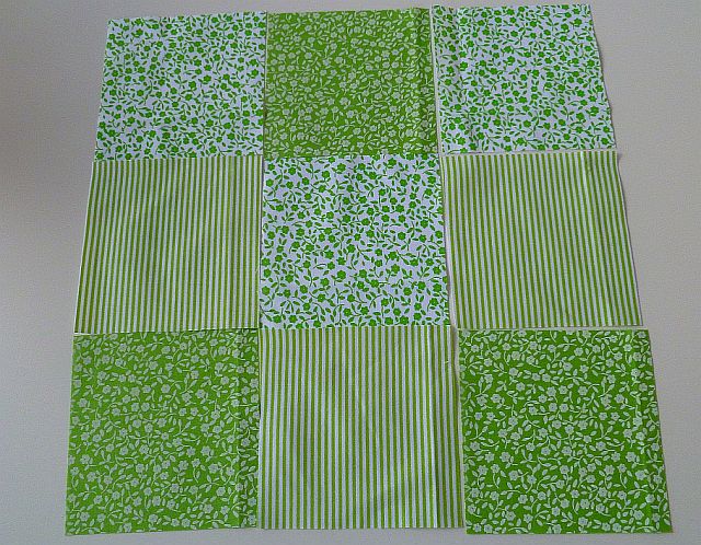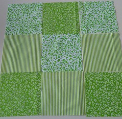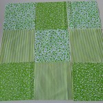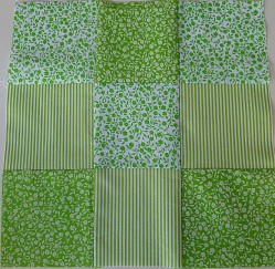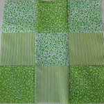 The first thing to do was choose my material.  This did take a while trying out different colour combinations. But eventually I decided on green as the colours looked fresh and lively together.  Dreading the cutting out, and remembering how long it used to take, I found out that cutting out is now done with a rotary cutter! After a little bit of practice I got going and within a few minutes my squares were perfectly cut and ready to sew together!