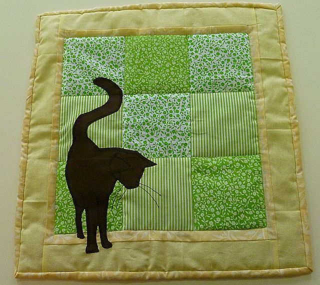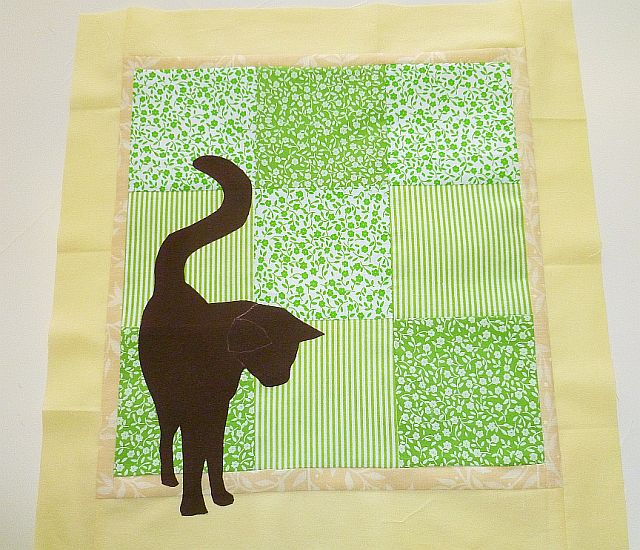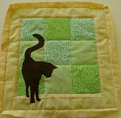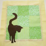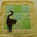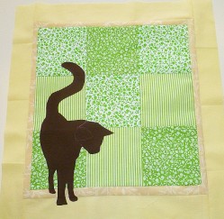 Once both borders were attached it was appliqué time. Appliqué is sewing a piece of fabric onto another piece of fabric and this is often done using a Bondaweb. Bondaweb helps stick both fabrics in place while you machine stitch around the outline of the fabric to permanently hold it. I decided to appliqué a cat and, after outlining it, used additional stitching to add some further detail to it.  For a quick tutorial on using Bondaweb have a look at our blog post on it.