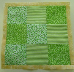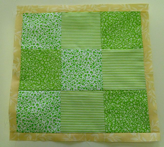 The patchwork squares were pinned together and then quickly and easily stitched together on the machine without tacking. With memories of the tortoise now firmly forgotten it was onto choosing a border for the patchwork block.  Having chosen the colours, strips of material were cut using the rotary cutter and these were sewn onto the edge of the patchwork block.