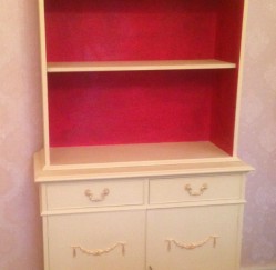 00Take a piece of 1980’s reproduction furniture. Well built and with years of life left in it but outdated. Use a few simple steps to transform it. First we removed the doors and filled and sanded the holes left by the hinges. Then we glued some mouldings to the cupboard door and took off the drawer handles. Next we used some sugar soap to clean it and remove an old dirt or grease. Then, to cover up the dark wood, we gave it three coats of chalk paint. Cream on the outside and red on the inside. Gold leaf was applied to the mouldings and drawer handles and the drawer handles were reattached. The paint was protected by applying a layer of wax and dark wax was applied to the red paint only to darken it. No sanding and minimal preparation and the piece was finished. To find out more about chalk paint click here....
