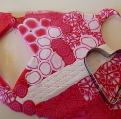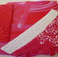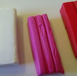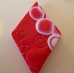 The first thing to do, and one of the most difficult for me, is to make a decision as to what colour clay to use. I seem to be naturally drawn to purple at the moment but wanted to make myself try something different colour wise. Eventually I choose and used half a block of white and a third of a block of red and a third of pink. You will see later on this quantity allowed me to make several pendants and still have quite a lot left over.