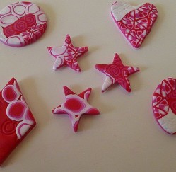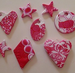 Using cutters I cut shapes out to make pendants. The last step, before baking, is to make holes in them to attach the findings to make jewellery. This was done with either a small cutter or a cocktail stick.