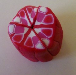 The Bulls Eye Cane is a sausage of clay with a thinner sheet of clay wrapping it. You can vary the cane by adding additional wrappings and varying the thickness of them.