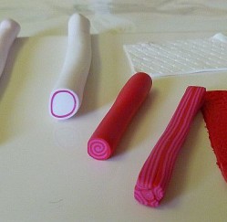 To make our pendants we use a base of clay and then cover this with slices from a Polymer Clay Cane. Canes are like sticks of rock. They are long and thin and have a pattern that goes all the way through them. To make my pendants I started by making a basic Bulls Eye Cane and a Jelly Roll Cane.